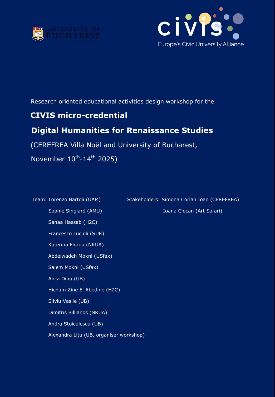 Between November 10th and 14th 2025, the Centre Régional Francophone d’Études Avancées en Sciences Sociales in Bucharest (CEREFREA Villa Noël) hosted the research oriented educational activities design workshop pertaining to the CIVIS micro-credential Digital Humanities for Renaissance Studies, organized (workshop) and coordinated (micro-credential) by Alexandra Lițu (University of Bucharest).All the partners in the project – the University Autónoma of Madrid, the University Sapienza of Rome, the National and Kapodistrian University of Athens, Aix-Marseille Université, the University Hassan II of Casablanca and the University of Sfax – were present in Bucharest. Two stakeholders were involved in the workshop. CEREFREA hosted the event and organized (Simona Corlan and Alexandra Lițu) a complementary book launch event (https://villanoel.unibuc.ro/2025/11/05/lancement-de-livre-the-ambassadors-notebook-pr-viorel-panaite/). ART SAFARI offered a guided visit on its premises for the participants.